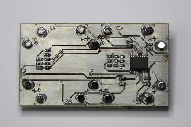 He añadido los archivos correspondientes del águila para que pueda reproducir, modificar o mejorar las placas. Una vez que el circuito impreso listo, comience agregando el IC y otros componentes eléctricos excepto los interruptores reed. Usted tendrá que comenzar con la adición de los componentes SMD, ya que el calor necesario para soldar en el lugar de lo contrario derretiría el pegamento usado para sostener los imanes.