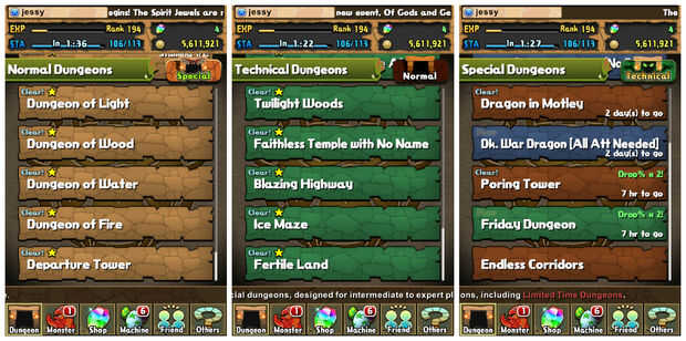 Estas mazmorras varían violentamente en marcos de tiempo, limitaciones del equipo y costo, pero son una gran manera de obtener monstruos raros, monedas, experiencia, habilidad ups, evo materiales y piedras mágicas. Compruebe siempre las mazmorras especiales para el día de la semana y plan de futuro para obtener mejores resultados