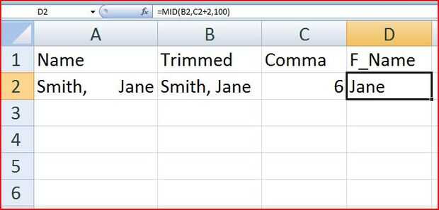 ¿Por donde empezar el nombre? Bueno, ya sabemos que la coma está en posición 6 (el número en la columna de la coma) y hay un espacio (Recuerde que hemos cortado la cadena) el nombre debe iniciar dos posiciones más allá de la coma (una para el espacio después de, entonces uno más para la primera letra en el nombre). En la celda D2 escriba la fórmula =MID(B2,C2+2,100) y pulse Intro. Usted debe ver a Jane en la célula. Aquí es cómo la fórmula sería traducida al inglés: tome la cadena en la celda B2, iniciar 2 personajes más allá de la coma y saque 100 caracteres. En Excel que dice tomar 100 caracteres decimos que toman todo lo de carácter 8 hasta el final de la cadena; Si hay 1 carácter o Excel 100 conseguirá todo.