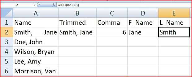 Ahora para el último nombre. Esta vez, vamos a utilizar la función LEFT, que tira de texto desde el lado izquierdo de la cadena (genial nombre, eh?). En la celda E1, escriba el encabezado L_Name. ¿Hasta dónde termina el apellido? Sabemos que la coma está en posición seis en este ejemplo, por lo que el nombre debe terminar 1 carácter antes de. En la celda E2, introduzca la fórmula =LEFT(B2,C2-1) y pulse enter. Usted debe ver a Smith. Traducido la fórmula dice: tome el número en la celda C2 y restar 1; tomar que muchos personajes de la izquierda de la cadena en la celda B2.
