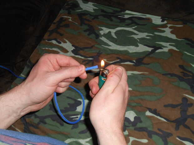 Para evitar el raerse que quiere fundir los extremos con un cuchillo caliente o mi preferencia un encendedor, solo ten cuidado porque los extremos estarán calientes y potencialmente podrían quemar. (Yo como siempre molde los extremos cuidadosamente para que sean aseados y limpieza según el proyecto.)