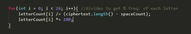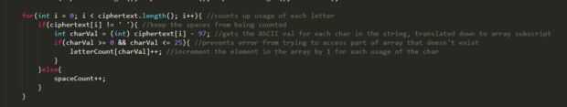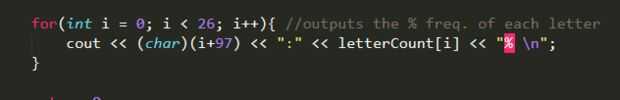 La primera parte es contar el número de veces que cada carácter se utiliza. La primera imagen muestra el código para hacer esto. Esencialmente se lazo el mismo número de veces que hay letras en la cadena, y cada letra es reducido a un subíndice de matriz. Entonces, se incrementa la matriz con el número de cada letra. Si surge un espacio, el programa incrementa una variable llamada "spaceCount" y no cambia nada en la matriz. Esto entonces bucles hasta que todos los personajes han sido procesados.