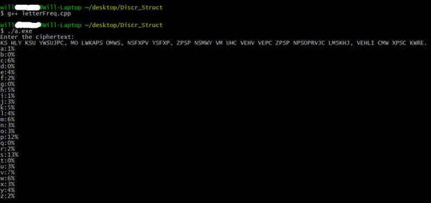Ahora que está compilado, podemos ejecutar el programa! Para ello, escriba ". / a.exe" para Windows o ". / a.out" para Mac. Esto entonces lanzar el programa, solicitar su entrada y darle las frecuencias de la letra. Vea para una imagen de todo esto.