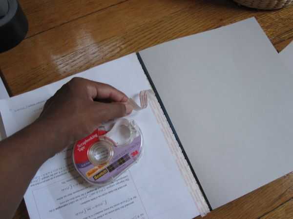 Con "cinta de encuadernación" enlazar las cubiertas a cada sección. Utilizar alguna cinta de doble cara scrapbook en las páginas primeras y últimas para mantener la tapa en su lugar. (ver imagen)