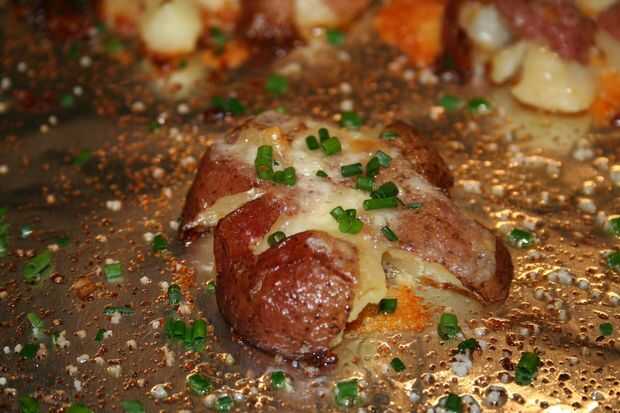 10. Gire el horno a asar a la parrilla y coloque papas nuevo para 2-3 minutos hasta que el queso se haya derretido.