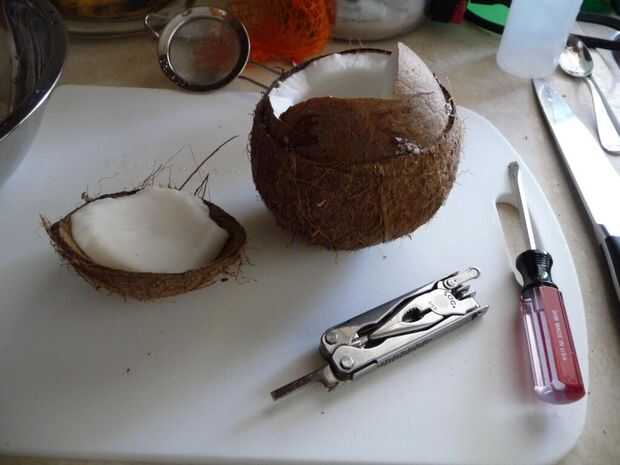 3. Retire del horno y dejar reposar un minuto o dos (que va a ser caliente) y quitar la cáscara externa dura con cualquier herramienta requieren: sobre todo de un golpe o dos con un martillo y palanca con el destornillador.