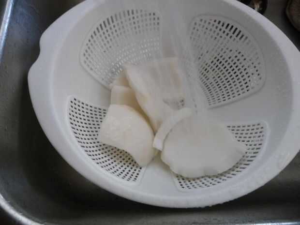 Cuando todo es pelado, dan los trozos de un buen enjuague para bajar cualquier partícula perdida.