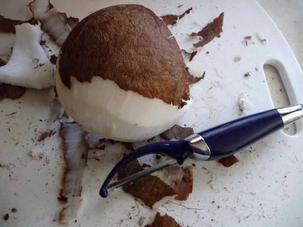 Una vez que la cáscara, necesita pelar la piel. Romper el coco en trozos manejables (si no el proceso de descascarado) y desprenda la piel con un pelador de verduras. Como limpiar cada fragmento, ponerlo en un colador en el fregadero.