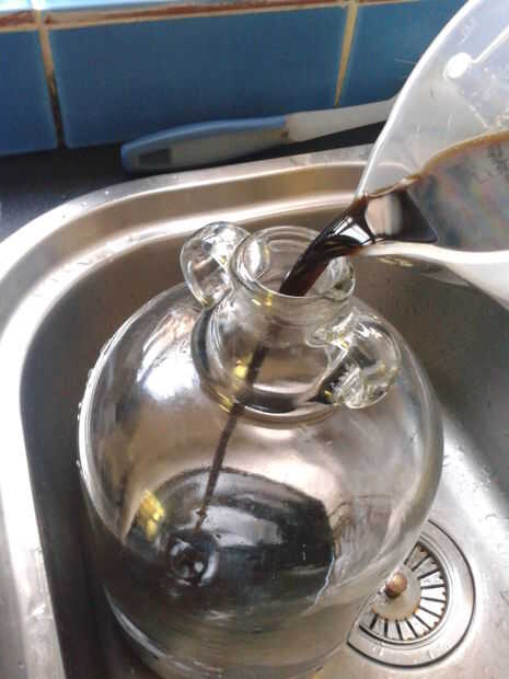 Como la escoria flotaba en la parte superior, pude ni echar ni sifón (bien quizás podría haber sifón, sólo no podía ser molestado para encontrar el tubo) para deshacerme de él. Recordando una lección de química desde hace mucho tiempo, me acordé de una brillante pieza de equipo llamado un embudo de separación forma de pera. Para los menos familiarizados con estas cosas poco inteligentes, trabajan mucho como un embudo normal, pero con un toque en la parte inferior y un enchufe en la parte superior. Me di cuenta podía crear un improvisado con una botella de coca-cola vacía con un pequeño agujero en la parte inferior del embudo de separación. Manteniendo un estricto control sobre la tapa, evitando que la presión de igualar dentro de la botella, así parando el líquido escapa a través del orificio se ajustaría la velocidad del flujo.