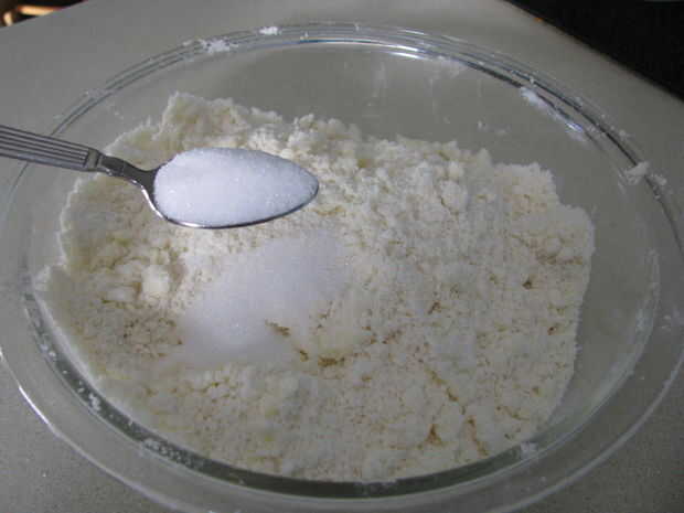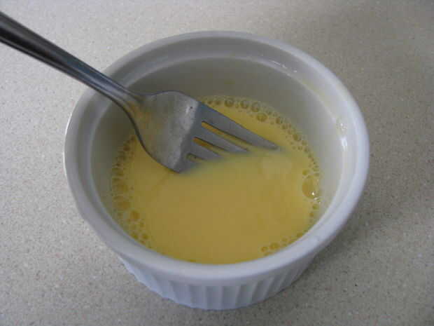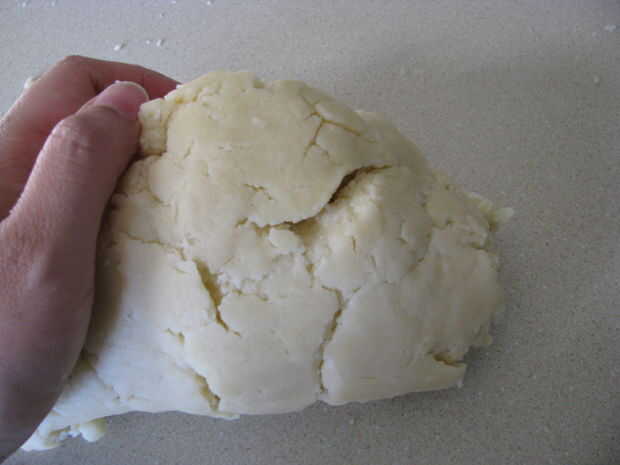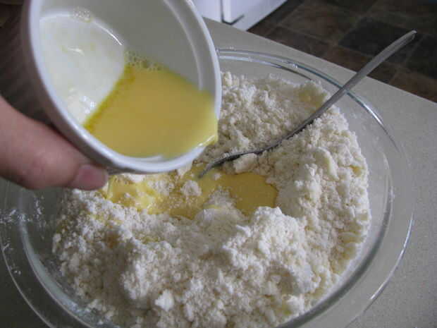 5. mezcla la yema de huevo y el agua y vierta la harina, mezclando rápidamente para formar una masa firme.
