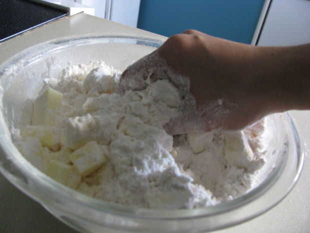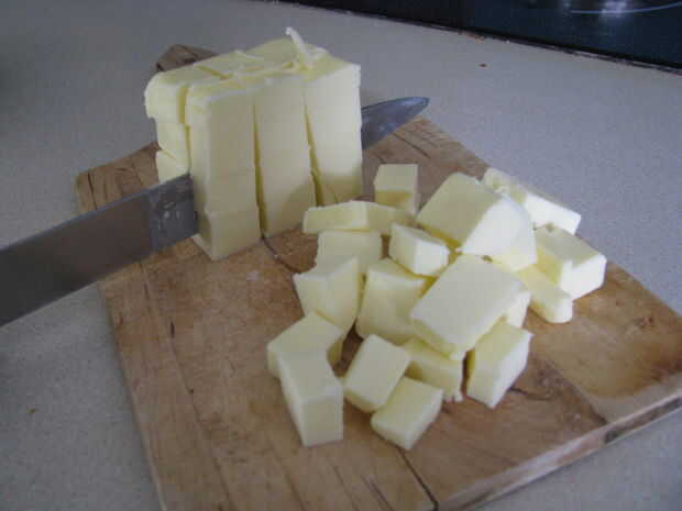 3. cortar 1 taza de mantequilla en trozos y frotar en la harina hasta que la mezcla se asemeja a las migas de pan.