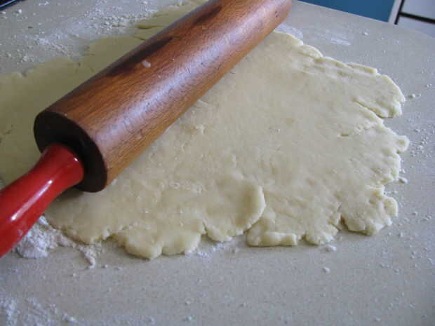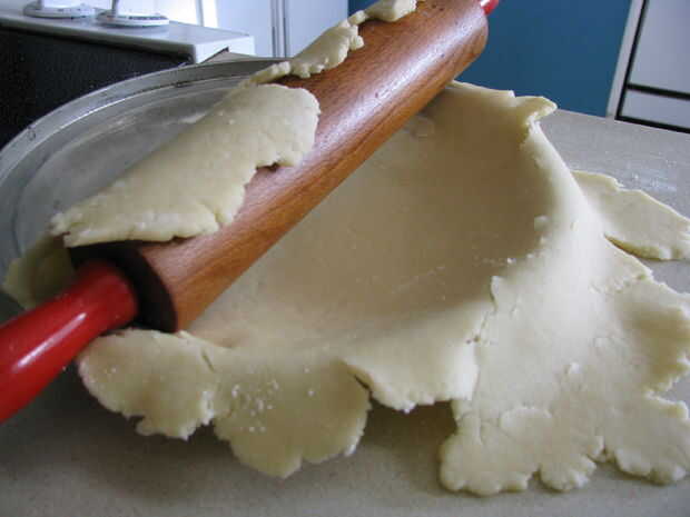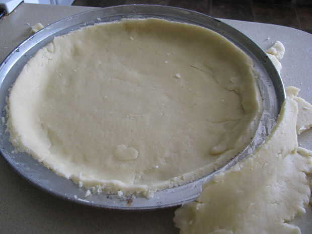 8. un plato de tarta untado con mantequilla con uno de los laminados de la línea piezas de masa.