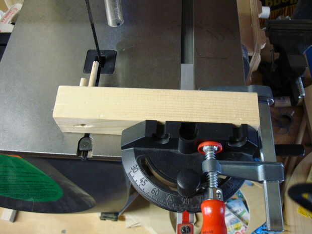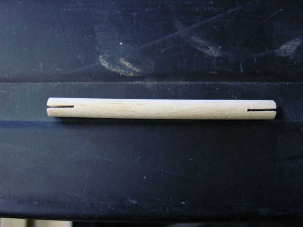Necesitará cortar 25 palos que son 1/4" de espesor por 3" de largo. Yo uso una sierra de banda porque obtiene una apariencia limpia agradable en los extremos. Una vez que los palillos redondos te cortan y luego utilice la sierra para cortar una ranura de 3/8" en ambos extremos del palo. Esto ayudará a los palillos para que no se atascan en las bolas y por contracción e hinchazón de la madera en diferentes climas. Una buena manera de conseguir un centro de corte cada vez en los palillos es hacer una plantilla. Cortar una 2 "x 2" x 8 "pieza de madera y perforados de 1/4" agujero en el centro a través de todo el camino. A continuación os adjunto lo la guía deslizante de madera con una abrazadera. Pero para I abrazadera que hacer el agujero en el 2 "x 2" firmemente centrada en la hoja de Sierra de banda luego apretar la abrazadera. A continuación inserte el palo en el orificio y empújela hacia la cuchilla. Esta manera puedo cortar un montón de palos y que centra todo el tiempo. Una vez terminado entonces utilizar un papel de 120 grano arena y lijar los bordes para desprender los residuos sueltos.