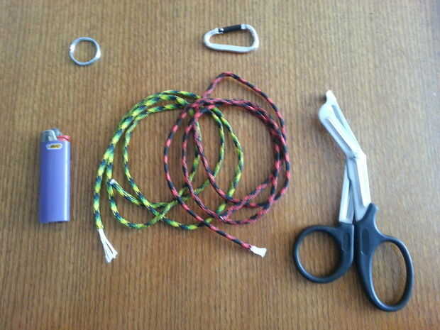 Para este proyecto en particular, he cogí dos cuerdas en cerca de tres pies. Asegúrese de que usted tiene algo filosos para cortar con su fuego lo necesario para terminar el proyecto y ningún botín adicional (llaveros o mosquetones) que desea adjuntar al final del proyecto.