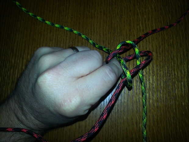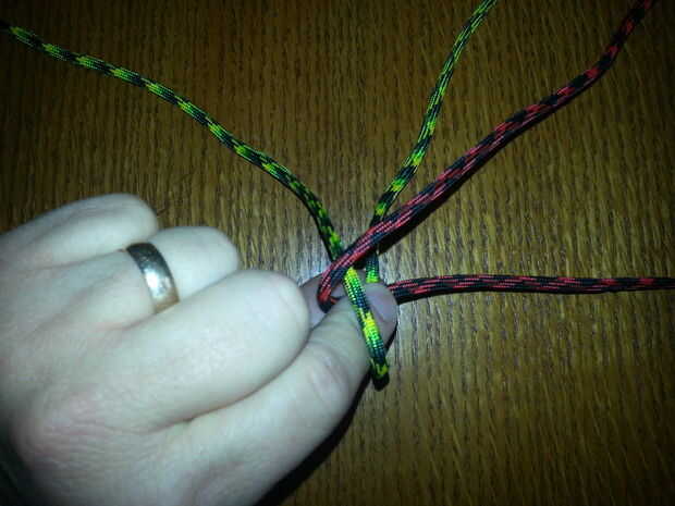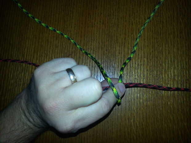 Como he intentado Mostrar en las fotos anteriores: empecé con el filamento de 6:00 y funcionó a 11:00 y coloca sobre. Esto difiere del nudo de la caja en que nos estamos off-ajuste el nudo para conseguir la forma redonda. A continuación, se trasladó a la cadena de 9:00 y corriendo a 2:00 y coloca sobre. A continuación, el filamento de 12:00 es correr a 5:00 y coloca sobre. Por último, la 3:00 strand es traído a través y escondido a través de lo que fue originalmente la 6:00 filamento.