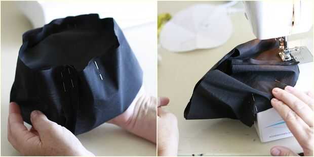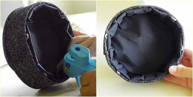 Para la guarnición, cortar un círculo de 7" de la tela. Corte una tira de tela 3-1/2 "x 25". coser los extremos cortos de la tira junto con margen de costura de 1/2". Círculo de tela a esto del perno y coser.  Recortar el margen de costura sobrante. Usar una pistola de pegamento caliente, pegar el revestimiento interior del sombrero, convirtiendo en 1".
