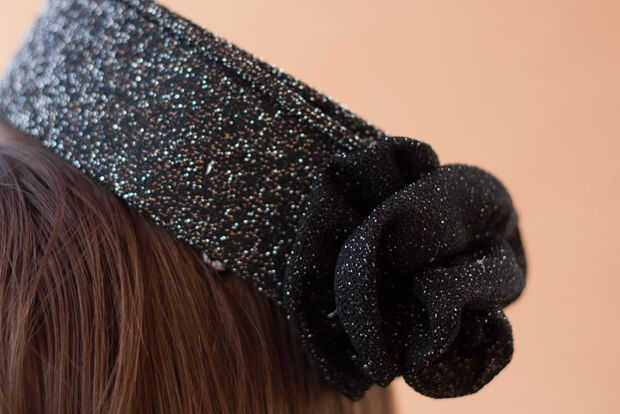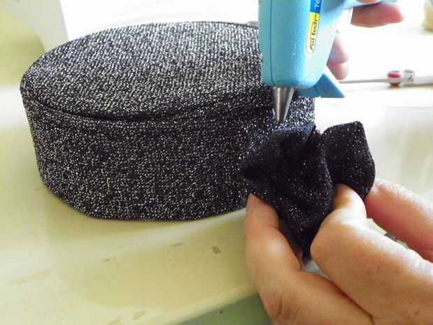 Corte una tira de tela de 3" de ancho x 30" de largo. Doblar por la mitad longitudinalmente y, con un punto de funcionamiento, se reúnen el borde cortado a unos 10" rollo de tejido recolectado, asegurar con unas puntadas como usted. Coser y seguir rodando hasta que la tira enrollada y cosida para que no se deshagan. La flor de tela para el lado del sombrero, cubriendo la costura del pegamento. ¿Ahora, no era tan fácil? Use su sombrero pastillero con un vestido simple y un collar de perlas.