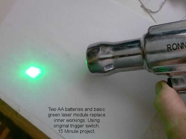 Acaba de abrir el caso, despojado a los componentes originales incluyendo los cables que anteriormente salieron el mango e insertan un soporte de batería 2xAA básica. Manteniendo el gatillo original en serie con un módulo de láser estándar, ponerlo todo en el.