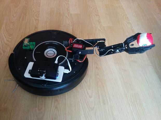 Actualmente mi Roomba está equipado con un pequeño brazo robótico. En el siguiente paso: voy a agregar control remoto de este brazo (a través de app para Android) y utilizar la vista de cámara para agarrar y mover objetos en el espacio marcado (operación en el modo semiautónomo) remoto.