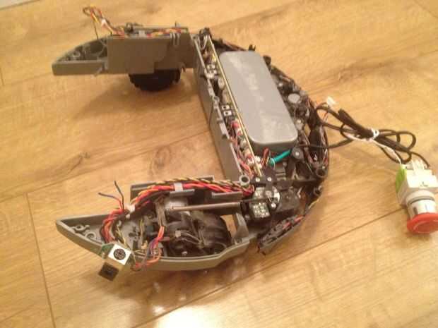 También tuvimos que cortar un poco el cuerpo de la Roomba para adaptarse a las dimensiones de la competencia (100cm de perímetro), hasta el punto que el ojo inexperto no sospecharía que nuestra base es una Roomba!