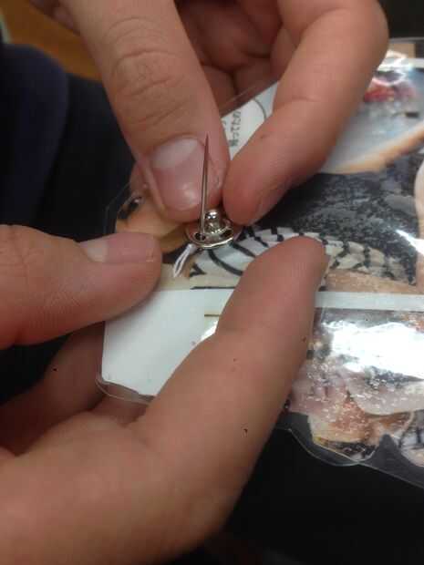 ・ラミネートした絵に、今度は先ほど使ったスナップボタンの凸を取り付ける。