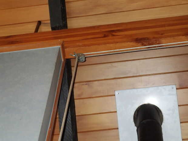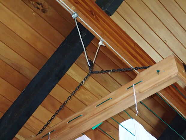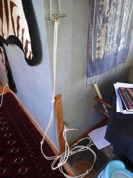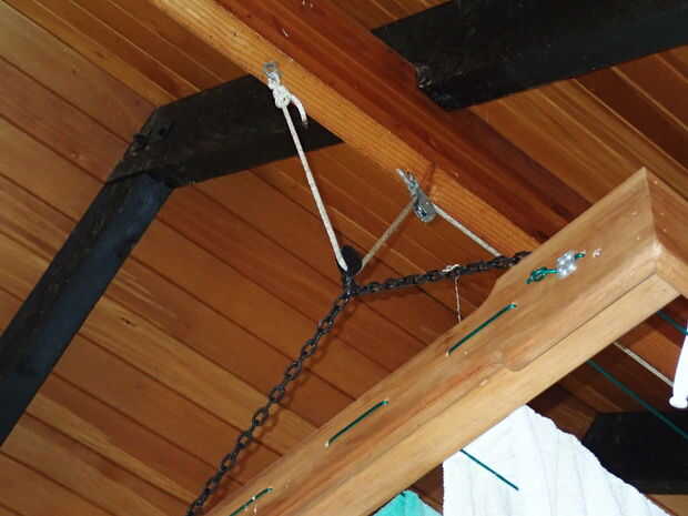 Los ganchos en la pared te permiten fijar el bastidor a varias alturas entre el techo y el piso. La primera polea (cerca de la parte superior izquierda de la primera foto simplemente cambia la dirección de la cuerda de pared a la viga del techo. Las poleas de la segunda y la terceros crean ventaja mecánica y elevación para el lado izquierdo de la parrilla (desde este punto de vista), y las poleas cuarta y quinta lo mismo para el lado opuesto. Después de que la cuerda pasa por la polea negra, moviéndose libremente, va directamente a un ancla en la viga.