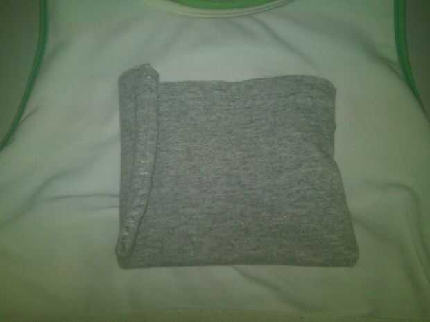 Vuelva el material. Una vez más, observe que doblé el material "hasta" por lo que tendría sólo dos costuras laterales coser (una muestra). El fondo es material simplemente doblado. Usé el dobladillo de la camiseta original para usar como mi acabado dobladillo en la parte superior. No hay necesidad de hacer más trabajo que usted tiene que! Se trata de una foto de la bolsa terminada, resultada el lado derecho.
