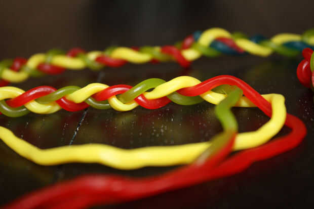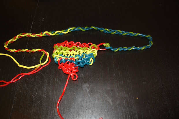 Ahora debe tener tres piezas. La trenza les juntos hasta que la trenza es la misma longitud que su medida de cintura. Esperar a que conecte este extremo de la trenza hasta el otro extremo de la entrepierna hasta que te los pones.