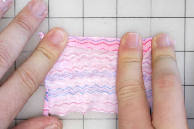 Pegamento y doblar los bordes de los cuadrados de tela de ropa interior para evitar que se deshilache después de coserlo.