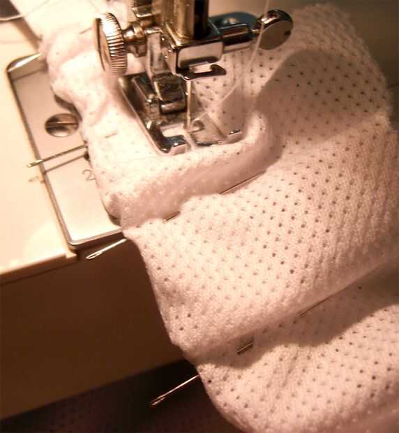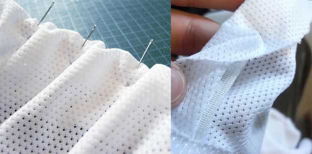 Este estilo (elástico dentro de la tela) requiere que la tela se agrupados para el elástico para estirarse cuando se ponga ropa interior. Para lograr esto cubrió en ubicaciones específicas, lo que permite un montón de tela agrupada entre los polos, que luego se tira de tela y elástico tirante mientras se cose.