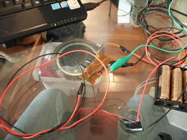 Para obtener el sonido en el chip, utilicé los cables del micrófono desoldered y enganchadas con pinzas de cocodrilo de un mini jack con algún cable pelado en un extremo y el conector en el otro. I conectar a mi ordenador, mantiene pulsado el botón "grabar" y empujado juego en mi computadora.