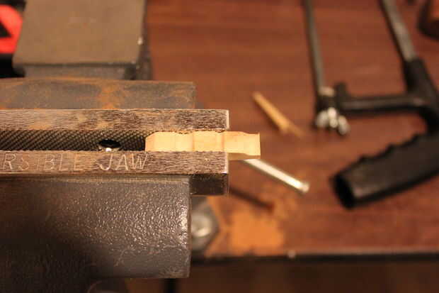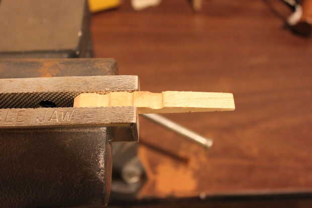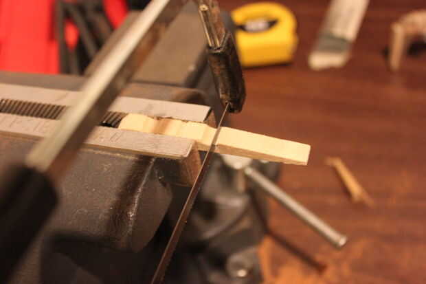 a continuación, tomar cualquiera de las dos piezas de madera. Corte a la derecha de la gran caída de la extrema derecha de la imagen. Hacer esto para ambos.