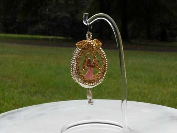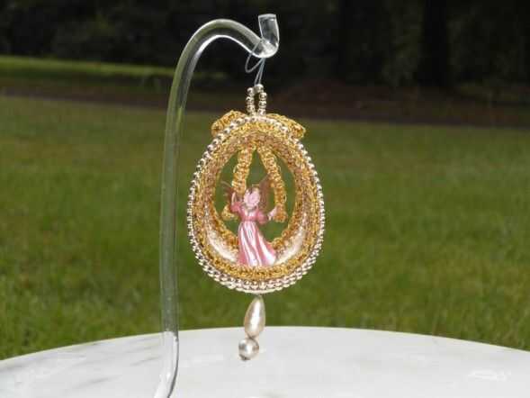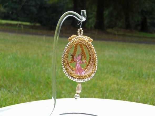 esto es un verdadero huevo con tres cortes de ventana. El interior está forrado con destellos rosados. Un recargado querubín con las alas de oro y un botón de vientre del rhinestone se sienta en el medio el huevo.