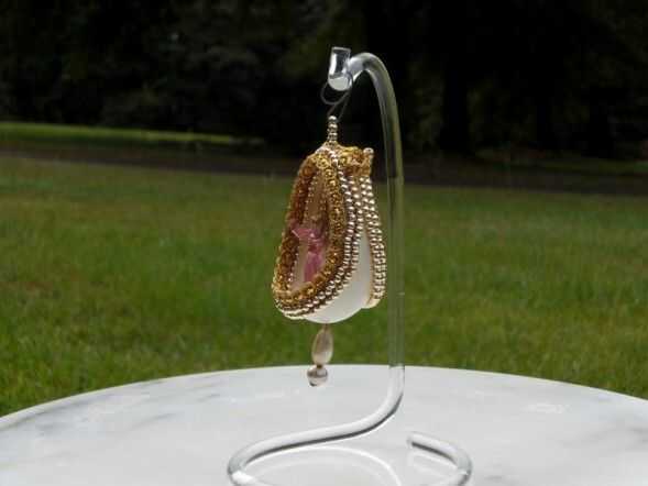 esto es un verdadero huevo. En el interior es un ave del paraíso de cristal. El huevo está decorado con flores, cintas, pedrería, apliques, pintura y diversos Permanentemente a la base.