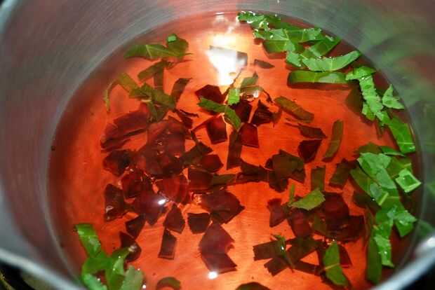 Vierta el agua restante en una cacerola y lleve a ebullición. Una vez hirviendo, punta de en la remolacha y las hierbas. Dejar hervir durante 4-5 minutos y dejar que hierva a fuego lento.