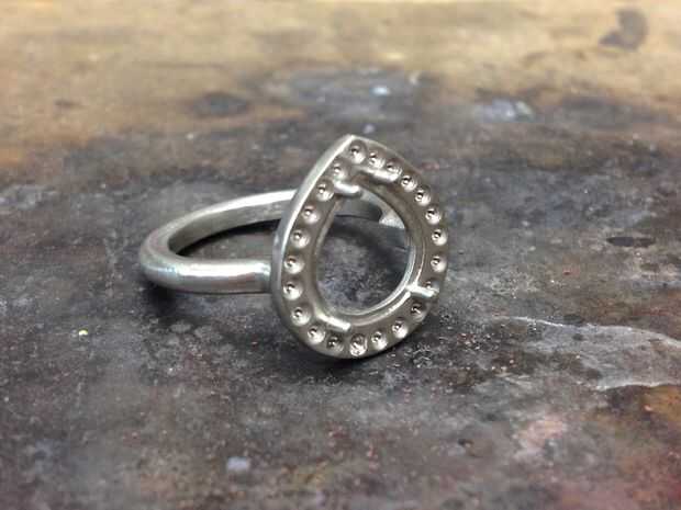 Una vez recibido el bastidor del rabos de colada de fundición se retira y las superficies del anillo se limpien y alisaron usando papel de lija y un pequeño disco con una herramienta giratoria. Luego se perforan agujeros en las hendiduras de la piedra en la parte superior del anillo. Taladré los orificios hasta la parte inferior de la frontera ya que hace mucho más fácil limpieza de anillos. También usé una fresa de bola pequeña para limpiar el borde de los orificios en la parte inferior de la frontera para asegurarse de que habría algún borde afilado.