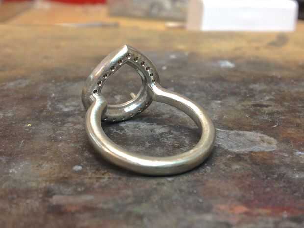 Una vez que el modelo 3D es creado es enviado para la fundición. Fue echado este anillo en oro blanco de 14K pero también fácilmente se podría hacer en plata o incluso platino. Para el modelo de fabricación y fundición de oro y plata aleaciones me como Mejor elenco como siempre hacen un buen trabajo y tienen tiempos de respuesta muy rápida. Para el platino y el paladio casting me gusta Techform- son una empresa de primera clase y siempre hacen un trabajo fantástico.
