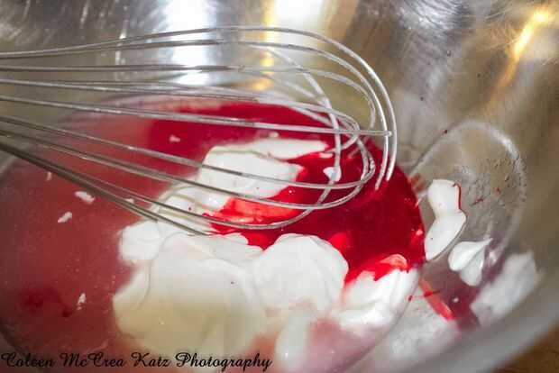 En un tercer tazón bata juntos crema, champagne y rojo colorante de alimentos. Debe buscar un poco como Pepto-Bismol.