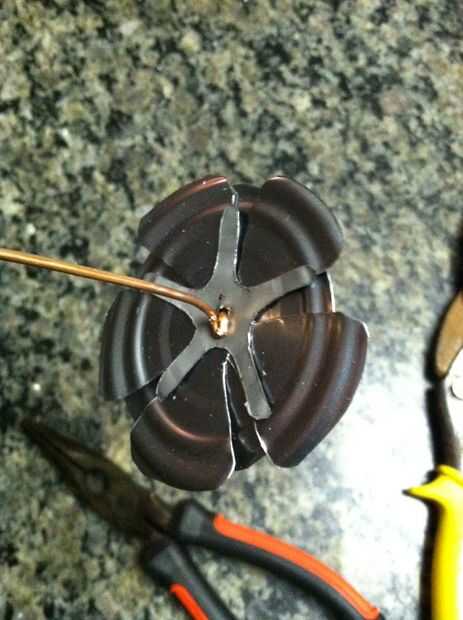Utilicé algunos cable de tierra 12 calibre sobra pero si el tuyo tiene el aislamiento necesita quitar que. Aproximadamente 2" de uno de los extremos hacer un bucle ajustado y pellizque firmemente cerrado. Esto apoyará todas las piezas de color de rosa. Deslice cada pieza en la parte superior comenzando con #1 al #6 y luego realizar otro bucle ajustado en el tallo para sostener las piezas pedal en fondo como sea posible. Apenas debería poder girar los pedales individuales para ajustarlos más tarde.