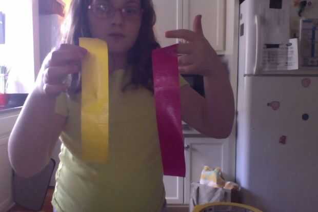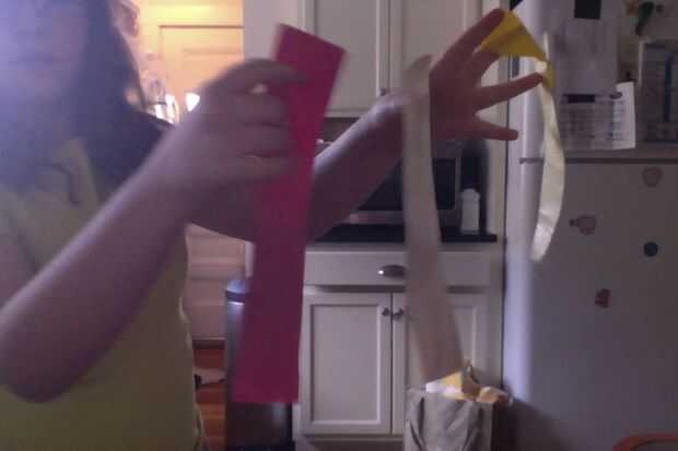 Cortar 3 tiras de 10 pulgadas cada uno de 3 colores diferentes de cinta. Todas ellas cortadas en dos.