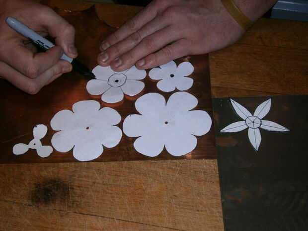 Utilizando el punto central como punto de referencia, perfore un orificio de 1/4" en el centro de cada conjunto de pétalos y el sépalo.