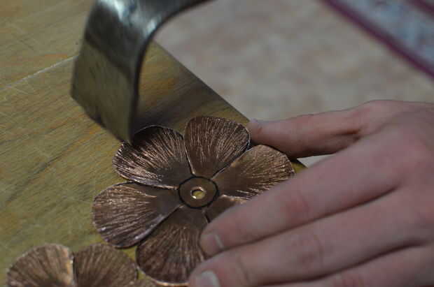 Consejo: Si tienes un hacha, martillo biselado o cualquier cosa con un borde afilado que puede oscilar, puede prefiere utilizar para texturizar puesto que las marcas no es necesario colocar profundo o exactamente. El borde afilado de una barra del cuervo trabajó muy bien para estos pétalos.