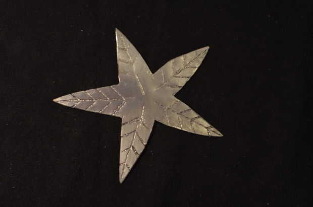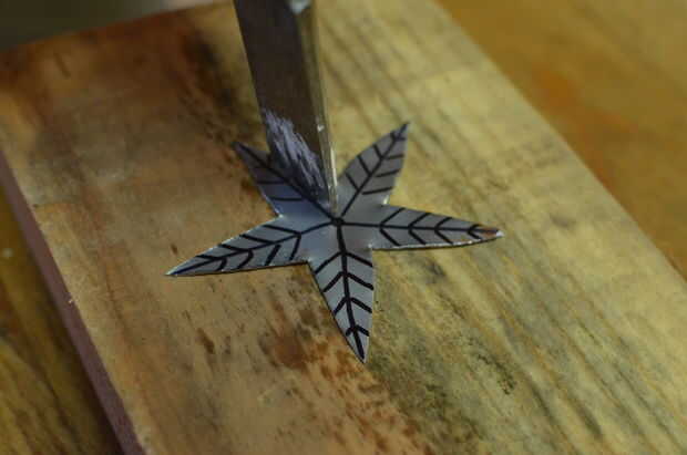 Una vez hecho esto, tome el martillo y el cincel y la puntuación el metal a lo largo de todas las líneas del grupo. Luego lavar las líneas de marcador permanente y tienes tu sépalo!