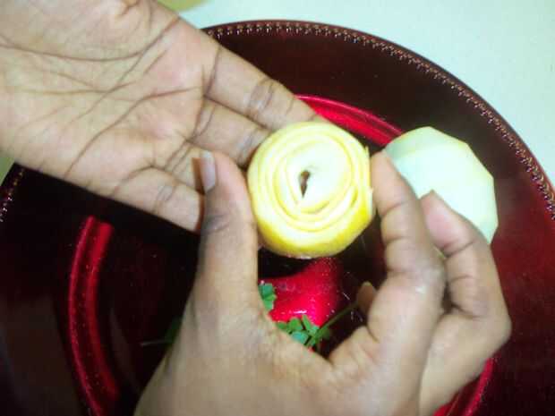 Lavar la fruta o verdura y secarla bien. A partir de la parte superior de la fruta, comenzar de pelar la piel con su cuchillo de cocina. Desea la parte superior. Dar la vuelta en un movimiento de espiral que va hacia la derecha. Pelar abajo y ponga su fruta a un lado. Ahora, toma la piel y de un lado, empezar a rodar. Desea mantener algo apretados pero no demasiado apretado para romperla. Rodillo hacia arriba y dale la vuelta. Usted es hecho! Se puede decorar con algunas "hojas" con perejil/cilantro; col rizada; o la piel de pepino. Con la piel del pepino, que desea cortar en pedazos de 2" de ancho, entonces puede usar el cuchillo y cortar sus hojas en la forma que usted desee. Sugerido de frutas / verduras para su uso: limón, naranja, tomate y berenjena.
