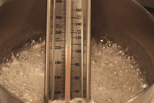 4. Encienda el calor hasta alta y pegan su termómetro de caramelo en. Ahora es el momento para sentarse y ver. Calor alto hasta que la temperatura esté entre 242 y 248 grados F. sin revolver, solo queda esperar y ver que burbuja y olor que el azúcar! Se tarda unos 10-14 minutos si haces toda la masa, un poco menos si haciendo un lote medio. Cuando entre 242 y 248, retirar del fuego.