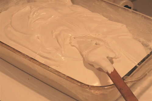 6. con una espátula, Esparza uniformemente en el molde que preparaste. (No te preocupes el raspar el bol cleanits casi imposible debido a la viscosidad). Polvo con más en polvo azúcar y utilice sus dedos para difundirla alrededor. (Me encanta la suavidad de ella!) Deja al descubierto durante unas 8-10 horas, o durante la noche.