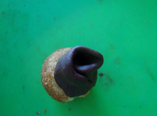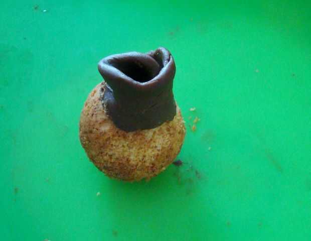 Hacer un pequeño rectángulo de chocolate derretido. Poner un borde en el centro de los pop cake y envuelva el resto alrededor para hacer el centro.