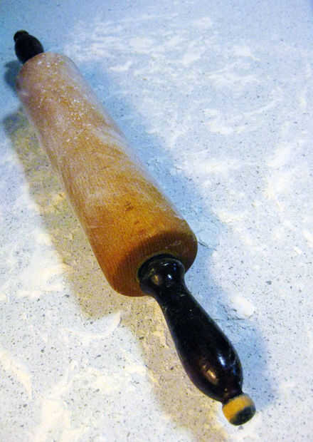 Puede hacer esto en una hoja de papel de cera. O si tu antigua como yo, puede polvo el área de trabajo con harina. Asegúrese de que frotar harina en el rodillo también. Esto evita que la masa se pegue a cada cosa. Si empieza a pegar, aplicar más harina.