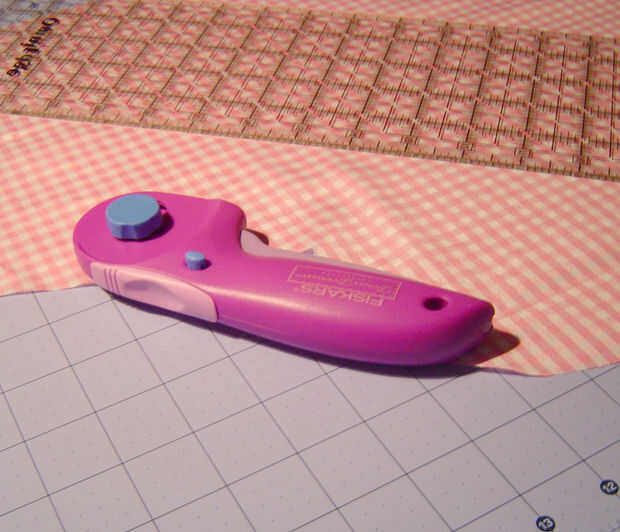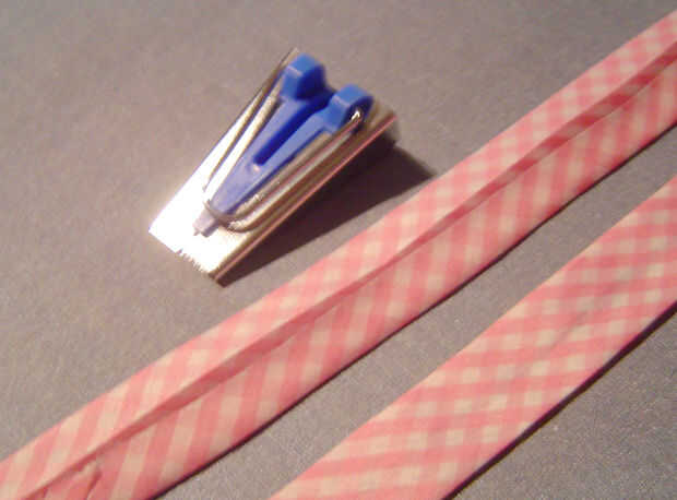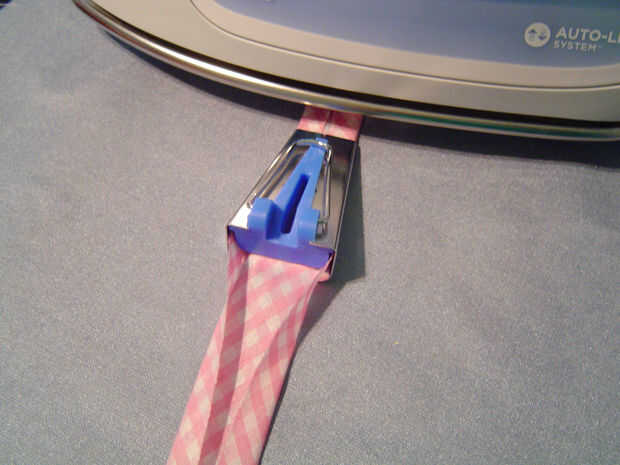 I made matching bias tape.  He seguido las instrucciones con la máquina de cinta de bies.  Corté tiras de bies de la tela el ancho requerido para el tamaño de cinta de bies que decidí usar.  Cosieron las tiras para formar una sola pieza larga.  Luego tiró de la tira de tela a través de la herramienta y presiona los pliegues resultantes en su lugar.