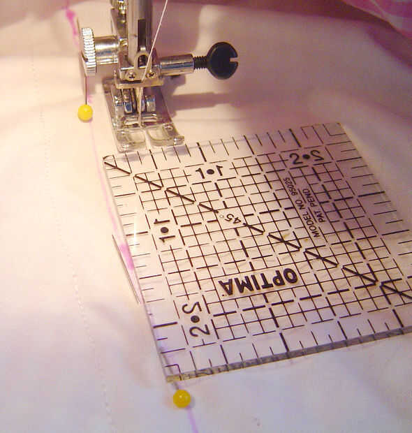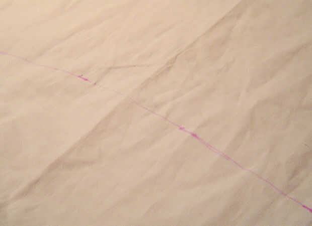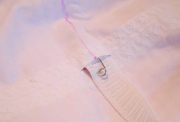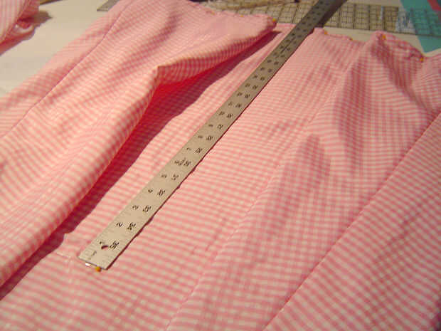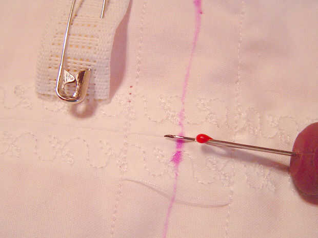 a continuación probé el vestido y marcada mi cintura en el vestido.  Entonces medí desde las marcas hasta el borde.  Usando a una tela que marca marcó la distancia desde el dobladillo hasta mi cintura completamente en el interior del vestido.  Luego cosí 1/2" a cada lado de esta línea para formar una cubierta para el elástico.  Luego abrí la caja en el centro de la espalda e inserta el elástico en la carcasa por medio de un perno de seguridad para ayudar a este proceso.  Luego se unió a los extremos del elástico y dejarlo todo en la carcasa.